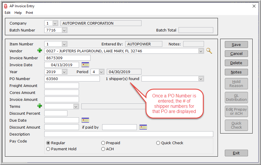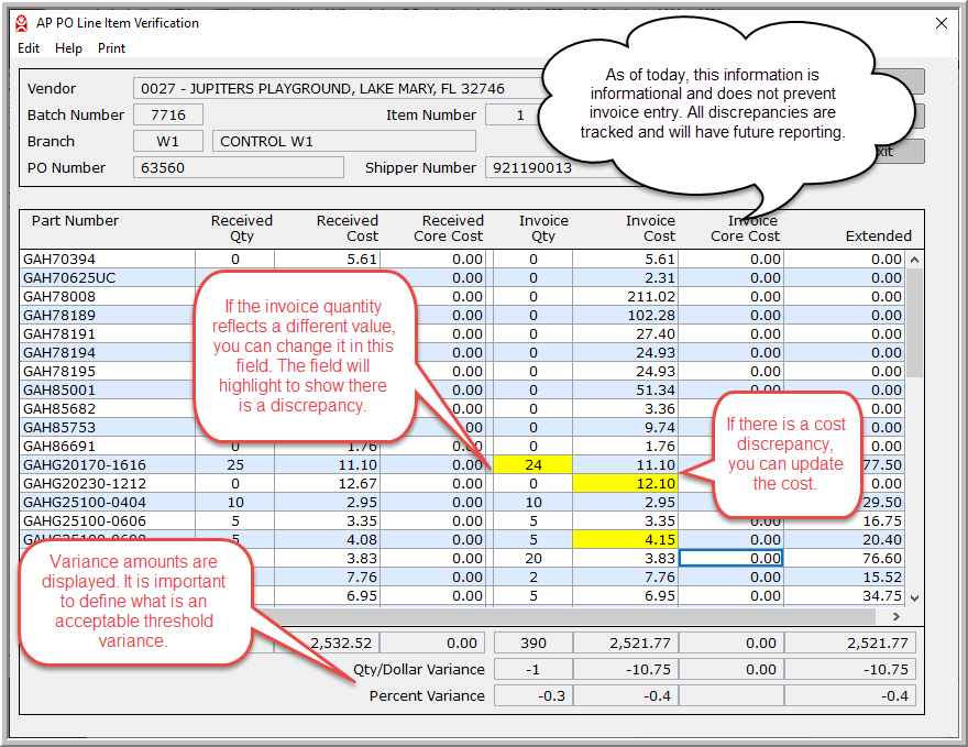 If you have the Purchase Order number, enter it into the PO Number Field. Note - if it was not received into the AutoPower system no data will be displayed.