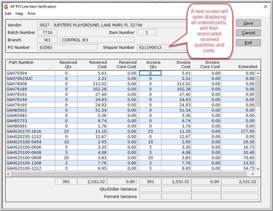 Clicking on the drop-down list displays a listing of all shipper numbers received for this PO. You can also type in the shipper number if you have it. This is an optional field and can be skipped entirely. Select the appropriate shipper number to display the list of received parts.