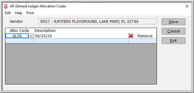 When this vendor is selected in Invoice Entry, the invoice will auto populate the Company, Branch, Department, and General Ledger account numbers as the default in the expense distribution.